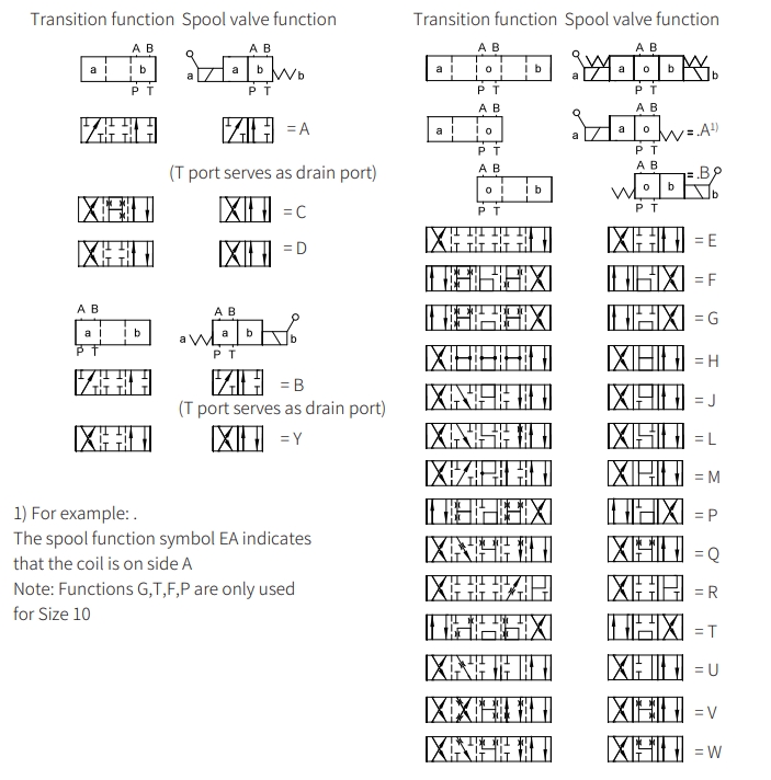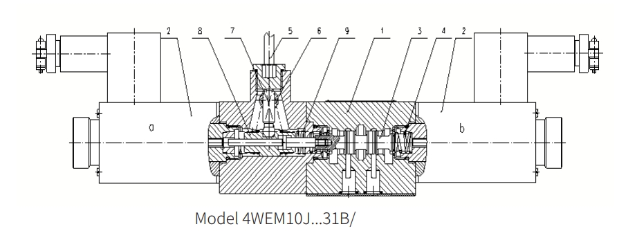 Cuando no hay potencia, el carrete de la válvula (3) está en la posición neutral o original bajo la acción del resorte de retorno. Cuando la fuerza del solenoide (2) actúa sobre el carrete de la válvula (3), se empuja desde la posición del resto a la posición terminal. De esta manera, el aceite a presión se realiza de P a A y B a T, o de P a B y de A a T. Después de que el solenoide (2) se apaga, el resorte de retorno (4) devuelve el carrete de la válvula (3) a su posición original.